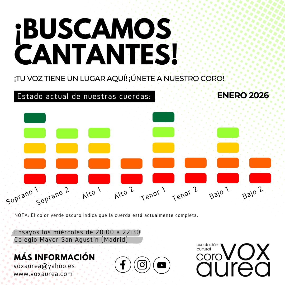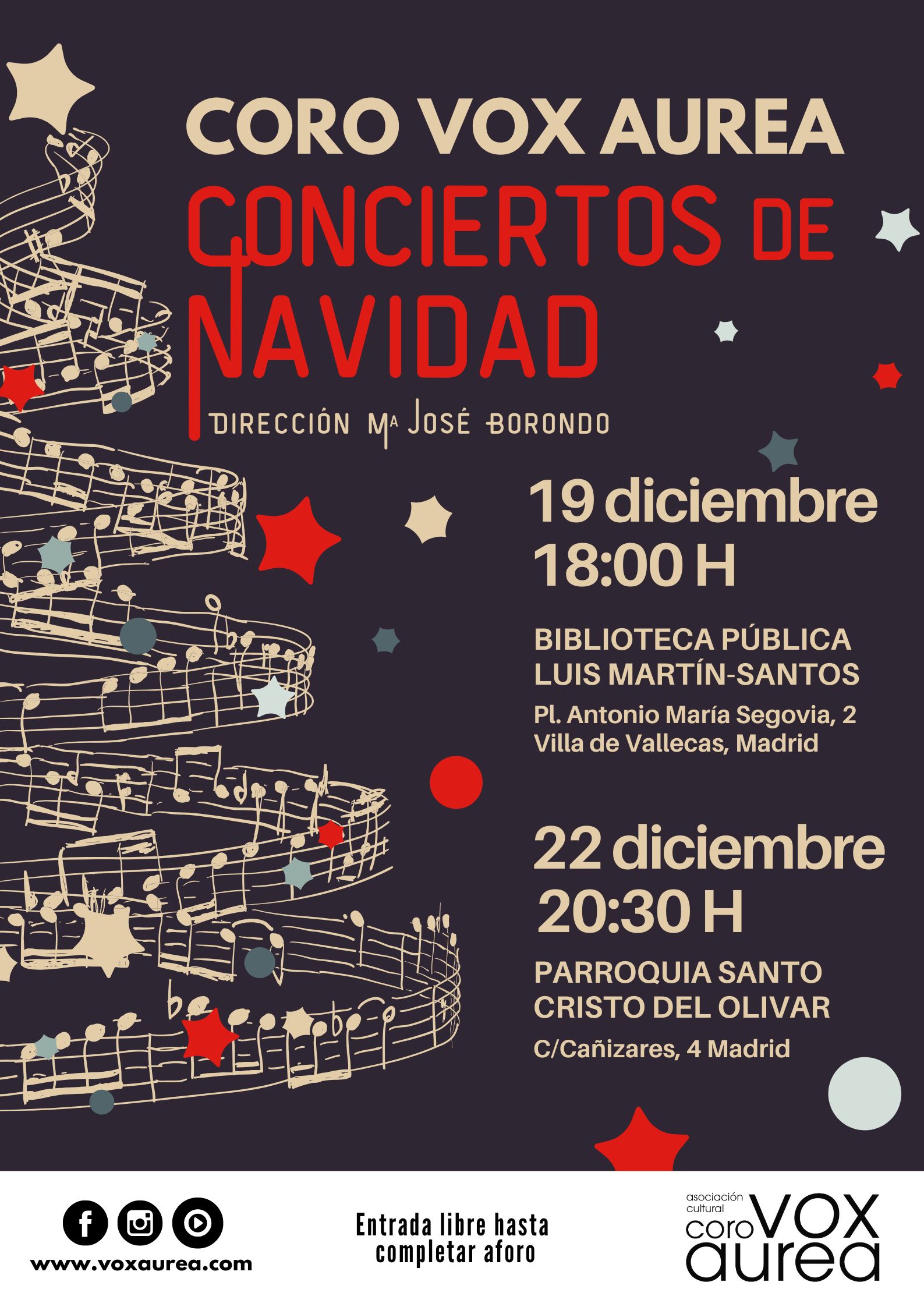 Fundado en 1994, el Coro Vox Áurea lleva más de tres décadas de excelencia musical. Esta formación mixta madrileña interpreta todo tipo de estilos y corrientes musicales. Su repertorio es amplio y abarca desde polifonía renacentista (Guerrero, Palestrina) y barroco (Bach, Purcell, Vilvaldi, Buxtehude) hasta obras folclóricas y contemporáneas de compositores como Carlos Guastavino, Dante Andreo, Vytautas Myskinis, Javier Busto, Eva Ugalde, Albert Alcaráz y Julio Domínguez, entre otros.